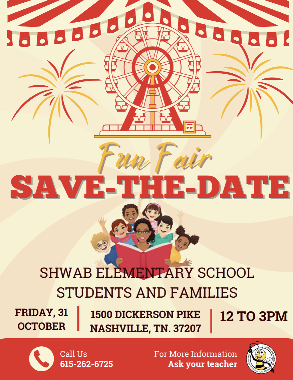 Shwab Elementary Fun Fair Join us for a resource fair and fall activities for the Shwab Elementary community! + Add to Google Calendar + iCal / Outlook export Date Oct 31 2025 Expired! Time 12:00 pm - 3:00 pm Location Shwab Elementary School 1500 Dickerson Pike, Nashville TN, 37207