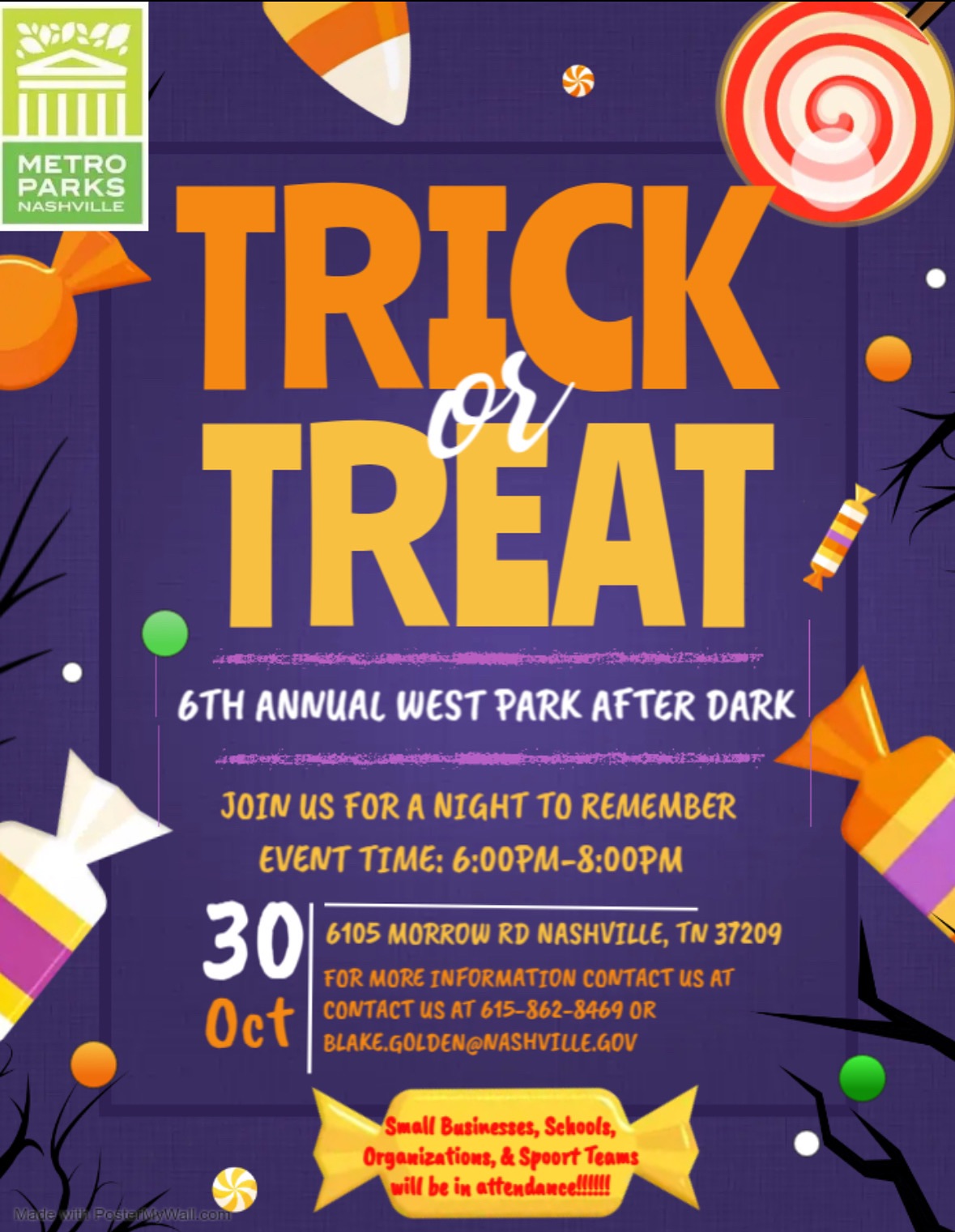 West Park After Dark Join us for lots of safe and spooky fun for the youth in the Nashville Community! + Add to Google Calendar + iCal / Outlook export Date Oct 30 2025 Expired! Time 6:00 pm - 8:00 pm Location West Park Community Center 6105 Morrow Rd, Nashville, TN 37209